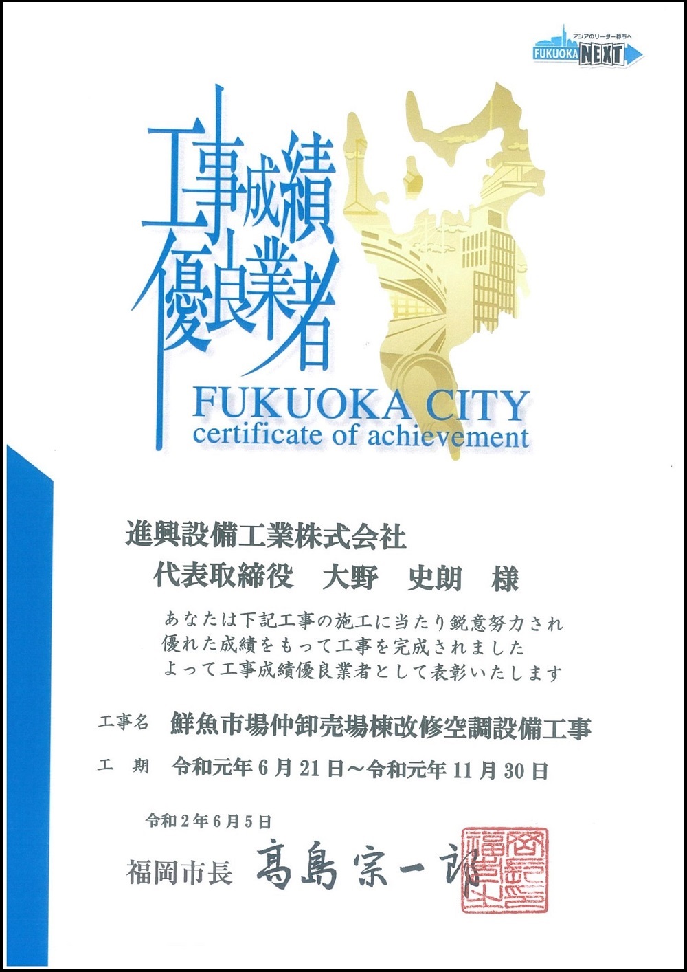 福岡市より工事成績優良業者の表彰を受けました。