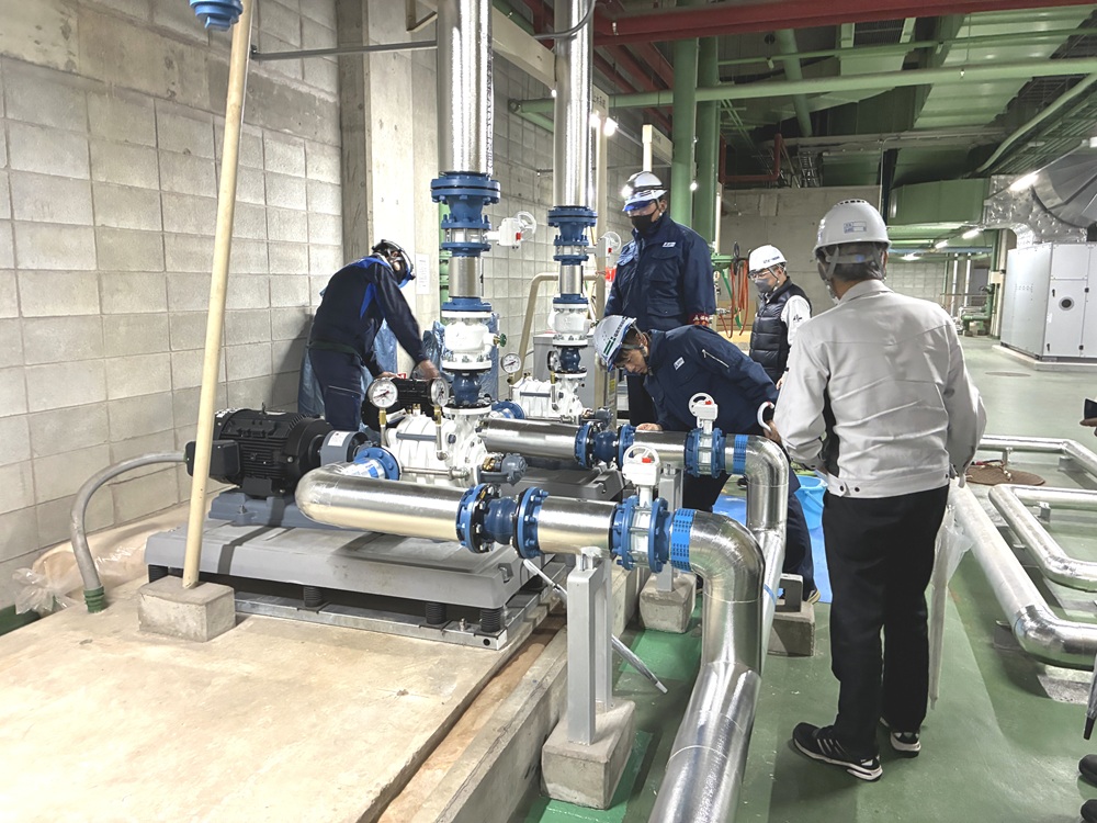 現地確認では、地下設備スペースでポンプの据付け状況や